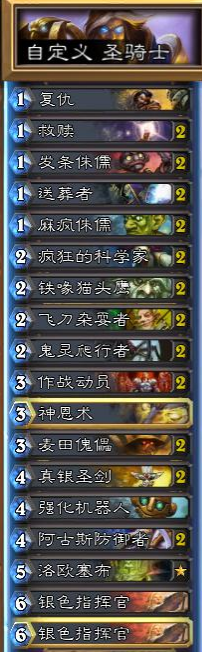 作為一套平民速攻圣騎卡組,這一套牌要求很低,只需要一張強(qiáng)化機(jī)器人和洛歐塞布,其他都是藍(lán)白,核心卡就是兩張作戰(zhàn)動(dòng)員和強(qiáng)化機(jī)器人。這一套牌并不依賴軍需官作戰(zhàn)動(dòng)員配合,而是用作戰(zhàn)動(dòng)員在前期起到解場作用以及確定前期優(yōu)勢的節(jié)奏,省去了奉獻(xiàn)生平就是因?yàn)槲覀兦捌诰湍苷嫉絻?yōu)勢,動(dòng)物園也比不過我們的鋪場速度。打法很簡單,最好起手留著作戰(zhàn)動(dòng)員,前期靠這個(gè)清對面的和占據(jù)前期優(yōu)勢,即便沒有抽到強(qiáng)化機(jī)器人基本上也能勝利。當(dāng)然即便沒有在起手就能拿到作戰(zhàn)動(dòng)員,也不要太擔(dān)心,滿編兩張還是不會那么背運(yùn)的,無論是單用還是配合飛刀,都很有效~最后三只以上仆從在場上時(shí),不要吝嗇,直接強(qiáng)化機(jī)器人,帶他們裝逼帶他們飛~讓對面只能“打得好,我認(rèn)輸!”作為沒有各位橙卡大哥,沒有軍需官的我們,天梯休閑照樣輕松勝利~!還有就是,這套牌開始是在送葬削弱前創(chuàng)造的,那時(shí)候的送葬確實(shí)是個(gè)BUG,但是在經(jīng)過反復(fù)試驗(yàn)后,依舊確定了送葬在這套牌里的地位,這套牌核心就是搶節(jié)奏控對面血量,強(qiáng)化機(jī)器人的威懾力,兩張銀色指揮官的打臉戰(zhàn)斗力往往是最后終結(jié)的閉幕曲。送葬雖然削弱,但是往往因?yàn)閷γ娴妮p視,估計(jì)錯(cuò)我們的用意,被我們養(yǎng)著打臉,對面很快也就失去了前期優(yōu)勢。