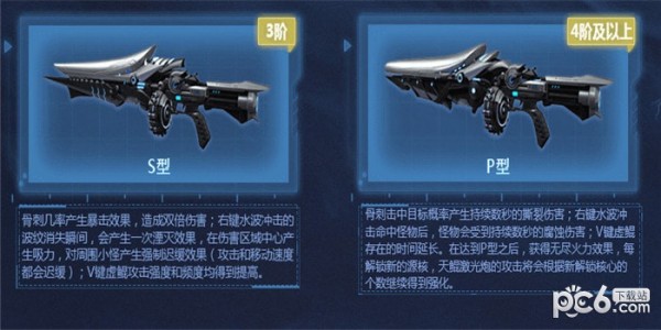 主武器+副武器:激活天鯤激光炮右鍵攻擊,扇形高能水波沖擊,緩慢前行一段時間后會在地面形成一個圓形范圍傷害區域,持續造成傷害;扇形水波沖擊會對小怪產生推后效果,直到水波前行停止,觸碰到障礙則水波沖擊直接形成圓形傷害區域。