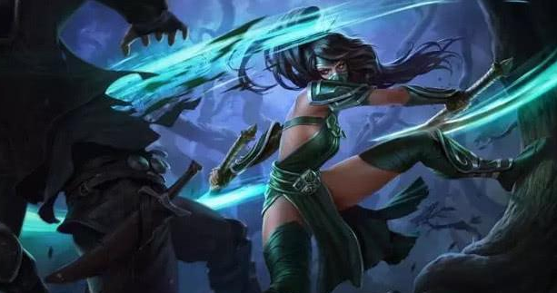 雙刀、蒙面、女刺客這些細節組合到一起,并且還有墨綠色的配色很容易讓人聯想到英雄聯盟里面的離群之刺阿卡麗,不知道黃月英的技能是不是會和阿卡麗類似呢?如果真是這樣的話,那又是一個強勢的脆皮收割機。