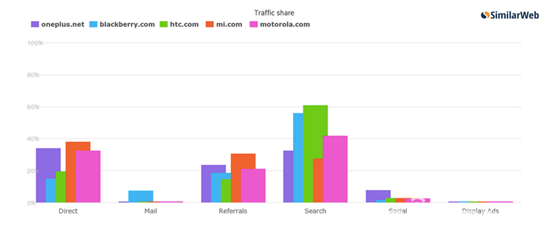 一加及其競品的官網(wǎng)流量來源對比數(shù)據(jù)圖