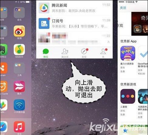 5、如果你的微信是在App Store中用自己的Apple ID賬號下載的,也遇到了閃退的話,應該是系統與軟件之間出現了問題,此時我們可以打開iPhone6手機的后臺管理,把微信從后臺退出去。