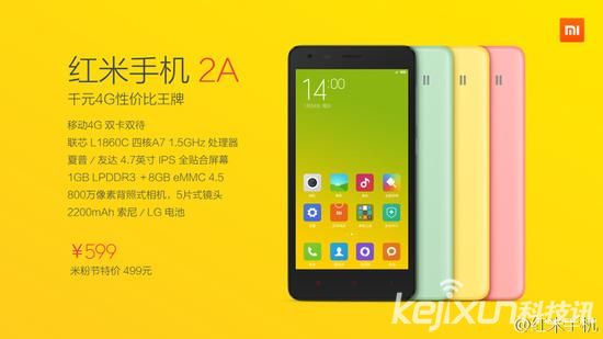 該機配備1GB運行內存和8GB存儲空間,后置800萬像素攝像頭,支持移動4G/3G/2G三模,以及雙卡雙待。紅米2A售價599元,在4月8日米粉節當天售價499元。