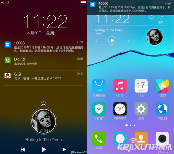 另外,最值得注意的是,基于Android 5.0深度定制的Funtouch OS 2.1系統(tǒng)在鎖屏界面上加入了可以顯示信息詳細內(nèi)容的消息通知欄,和iOS非常類似,并且效果看起來非常唯美。