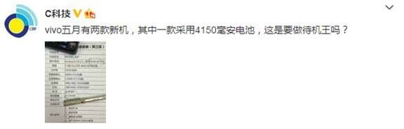 據@C科技稱:vivo五月有兩款新機,其中一款采用4150毫安電池,這是要做待機王嗎?