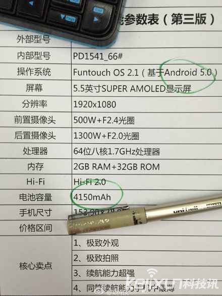 該機搭載了基于Android 5.0深度定制的Funtouch OS 2.1系統,擁有分辨率1920x1080像素的5.5英寸AMOLED屏幕,達到目前主流水平,而4150mAh的電池則是vivo史上最高的電池容量,就算在整個手機市場中也可以傲視群雄,看來一直以淺薄的極致外觀征服用戶的vivo,此次也決心在超長待機這條差異化道路上試試看,不過這也倒是符合vivo擅長的極致差異化風格。