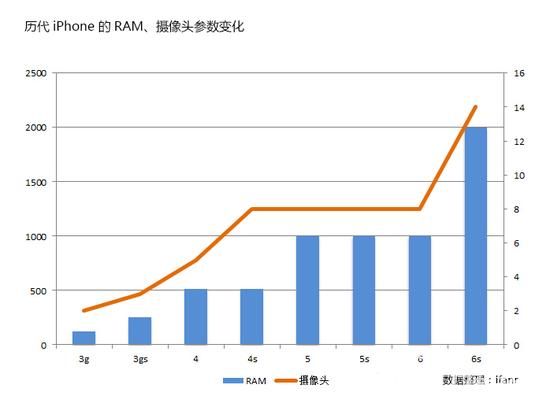 根據(jù)愛范兒報(bào)道, 知名分析師 Ming-Chi Kuo 預(yù)測(cè) iPhone 在下一次升級(jí)中將大幅提升硬件,首當(dāng)其沖的就是 Force Touch 的加入。另外,Kuo 還預(yù)測(cè)蘋果將把主攝像頭從 8 MP 升級(jí)至 16 MP,RAM 從 1GB 升級(jí)至 2GB。按照以往的經(jīng)驗(yàn),iPhone 在硬件上的升級(jí)非常的溫和,攝像頭從 4s 到現(xiàn)在依然是 8 MP,RAM 從 5 到現(xiàn)在依然是 1GB,下圖是歷代 iPhone 兩項(xiàng)參數(shù)的縱向?qū)Ρ取?/p>