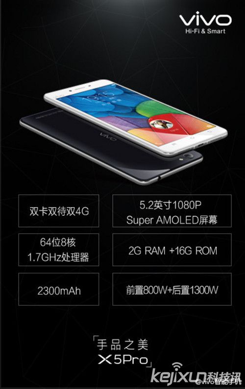 vivo X5Pro采用5.2寸1080P AMOLED顯示屏,搭載1.7GHz MTK6752八核處理器,內置2GB RAM+16GB ROM存儲組合,前置800萬+1300萬像素F2.0后置攝像頭,支持相位對焦和雙卡雙待雙4G,配備2300mAh容量電池,延續極致Hi-Fi。