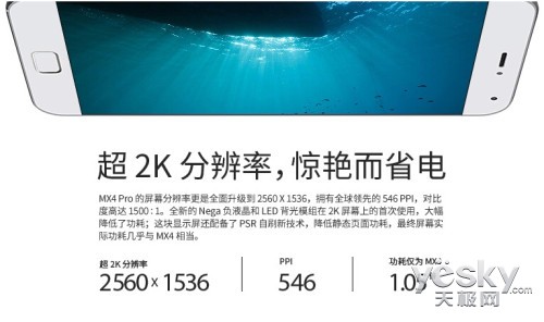 魅族 MX4 Pro采用了分辨率為2560*1536 的 5.5英寸2K+屏幕,首次將全新的 Nega 負液晶工藝運用其中,PSR屏幕自刷新、動態壓縮技術等方面的技術融合,保證了 屏幕耗電的控制。
