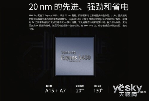 魅族選用領先20nm制程的三星Exynos 5430八核處理器,包含 4 顆ARM Cortex-A15 核心和4顆節能的 ARM Cortex-A7 核心,big.LITTLE 架構使得 MX4 Pro在運行大型游戲或者觀看 4K 視頻時有獨特的優勢。同時,改進的CPU制程讓整機更省電。其內置 Mali-T628 MP6 GPU配合3GB超大內存完全能勝任移動平臺的3D游戲大作。存儲空間有16GB、32GB、64GB可選。