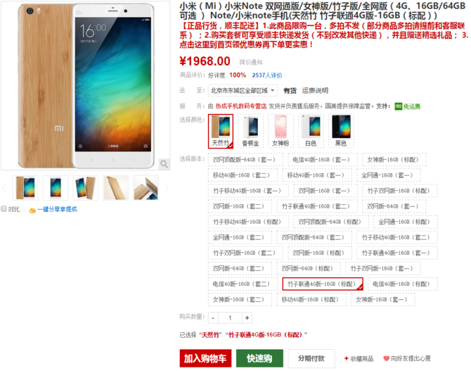 小米Note可以說是小米有史以來外觀最漂亮的一款手機(jī)了。當(dāng)然,其硬件配置在國內(nèi)手機(jī)市場(chǎng)中也是屬一屬二的。而且為了迎合市場(chǎng)的需求,小米Note還推出了女神版、竹制版、全網(wǎng)通版、頂配版等等,滿足了大多數(shù)消費(fèi)者需求,人氣也是非常高。小編最近驚喜的發(fā)現(xiàn)國美商城中的小米Note竹制版/頂配版已經(jīng)跌出官網(wǎng)價(jià),僅需1968元,而且是現(xiàn)貨閃發(fā),喜歡的朋友千萬不要錯(cuò)過了。