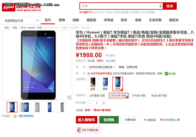 榮耀作為一個從華為獨立出來的互聯網品牌,主攻線上渠道,榮耀7同樣也是采用了線上預約搶購的銷售方式。不過由于供貨不足,如果是想盡快購買到該機的話,之前只能通過加價的方式入手,然而目前現貨價格直接跌破官網價,再也不用去官網搶購,喜歡的朋友不容錯過。