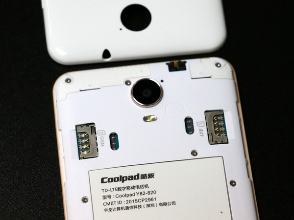 鋒尚2背部采用納米陶瓷工藝,高密度噴涂工藝身機,膜內注塑技術,帶來了具有質感的弧面設計。頂部正中位置為主攝像頭與閃光燈。稍靠下為酷派“Coolpad”標識,底部還有4G LTE字樣。鋒尚2采用了一枚800萬像素的主攝像頭,產品的后蓋是可以拆卸的,手機的SIM卡插槽及擴展卡插槽全部位于電池倉內部。
