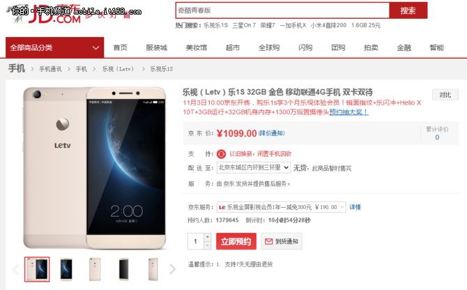 京東商城:金屬機身+鏡面指紋識別 樂視超級手機1s 1099元 ,,