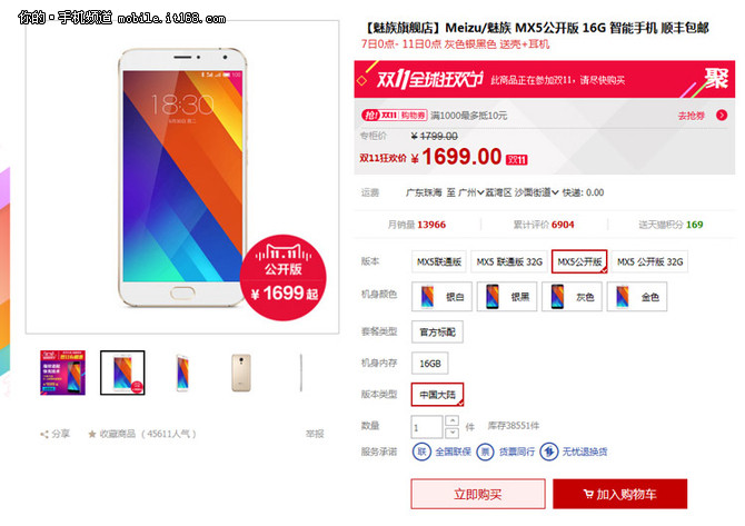 編輯點評:目前魅族MX5已正式開放銷售,用戶可從魅族官網、魅族天貓店和京東商城進行直接購買,雙十一期間1699元的原價入手,顯然還是非常超值的。
