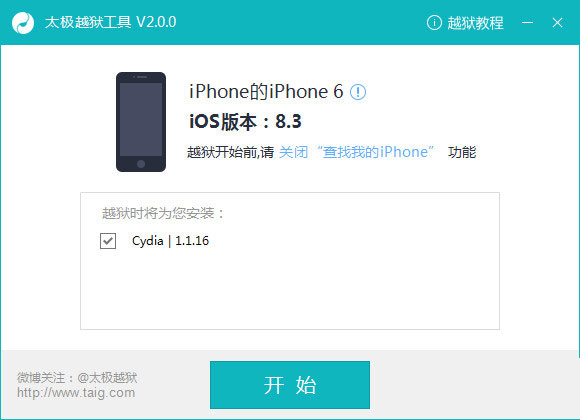 3.越獄工具自動識別后,如下圖所示,會提醒您關閉“查找我的iPhone”功能,如果你確認已關閉,可忽視該提示文字。點擊按鈕【開始】。