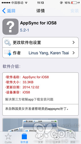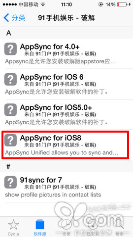 添加完源地址后,直接進入91源內安裝appsync補丁,具體操作步驟:點擊進入91源,分別進入【破解】分類中找到【AppSync for iOS8】,點擊右上角的【安裝】按鈕,再點擊右上角【確認】,Cydia就會自動安裝好appsync補丁,安裝好后,請務必重啟下設備使其生效。