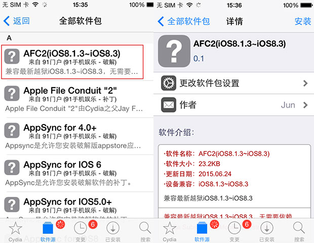 直接進入91源內安裝AFC2(iOS8.1.3~iOS8.3)補丁,具體操作步驟:點擊進入91源中找到【AFC2(iOS8.1.3~iOS8.3)】,點擊右上角的【安裝】按鈕,再點擊右上角【確認】,Cydia就會自動安裝好AFC2(iOS8.1.3~iOS8.3)補丁,安裝好后,請務必重啟下設備使其生效。