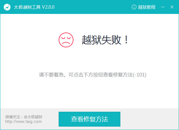 3、如果越獄失敗,請先檢查越獄工作準備及前提條件是否已完成,如屏幕鎖定設定為永不鎖定,取消鎖屏密碼,關閉查找我的iPhone,若以上前提條件已完成,請點擊越獄工具上的“查看修復方法”。