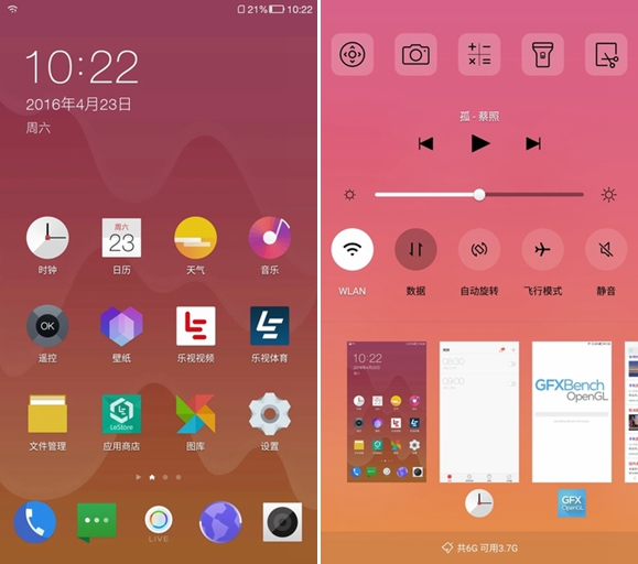 關于系統這方面其實大家可以去去看本站的【樂視手機2評測】一文,這款樂Max 2均是運行安卓6.0定制的EUI 5.6用戶界面,在這里關于系統評測筆者僅簡單的介紹一下,EUI用戶界面最大的特色就是擁有三種系統桌面,主要依托了樂視強大的視頻源,這也是樂視對外宣稱的一種生態模式。