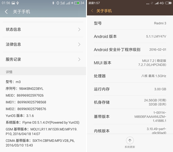 ▲系統信息(左:魅藍3 右:紅米3)