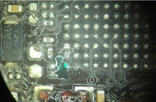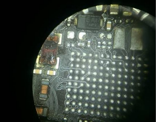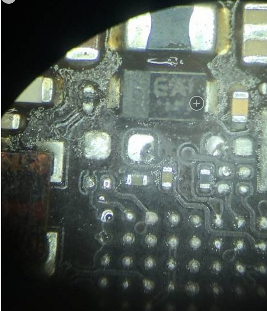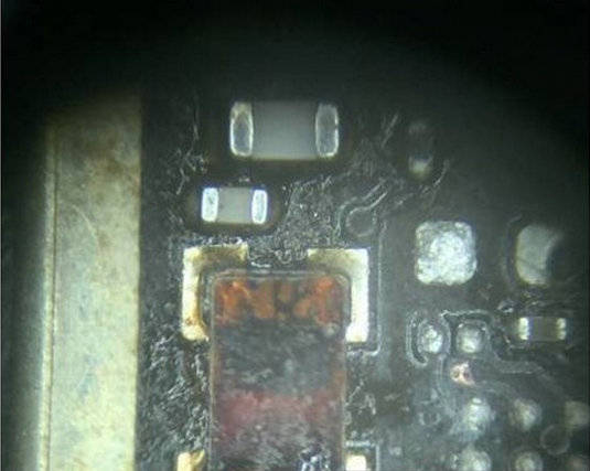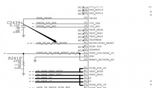 蘋果6P于2014年發(fā)布,至今快兩年了,很多6P摔過之后會出現(xiàn)觸摸失靈,并且屏幕上方會閃白條。其真正的原因就是觸摸IC U2402虛焊或者斷線。如果重置芯片不行,或者重置芯片能用,過段時間又不能用的那就是焊盤有斷線了。由于維修時拍未下照片,所以就拿個廢板做演示了。通過打阻值發(fā)現(xiàn),焊盤M1腳阻值偏大,在后來的維修中發(fā)現(xiàn),這個焊點非常容易出問題。如果是UMT的板子,那么這個焊點基本會掉,其他板子也是處于非斷不斷之間,所以有些機子重做IC用一段時間故障依舊,就是這個原因了。那么要徹底解決這個問題,就需要飛線了。最后查詢圖紙發(fā)現(xiàn)M1腳的定義是顯示觸摸同步信號。