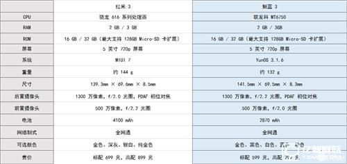 如果說外觀部分純屬于主觀意見,那到了硬件部分就直接高下立判了,紅米 3 與魅藍 3 具體參數如下: