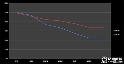 續航上其實看硬件配置也知道紅米 3 要強于魅藍 3,畢竟前者電池容量多了 1230 mAh,差距還是有些大的。通過 5 小時的續航測試(包括 1 小時在線視頻播放,1 小時聽音樂,1小時刷網頁,半小時玩游戲,半小時刷微博,半小時拍照和半小時待機),紅米 3 最終剩余 68% 電量,而魅藍 3 則剩余 45% 電量。