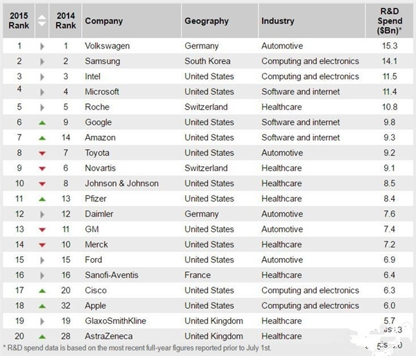 那么蘋果排在第幾呢?榜單顯示,蘋果排在了第18位,在同一行業落后于大部分重要的競爭對手,包括排在第六的谷歌和第七的亞馬遜。有意思的是,實際上蘋果在研發支出上比微軟少了將近50%,2015年全年支出勉強達到60億美元。