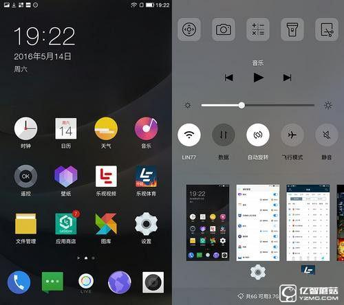 主界面很簡單,黑色界面依然是小編推薦的,因為能更好的呼應無邊框ID,UI設計以扁平化風格為主,干凈簡潔。下拉菜單只是后臺任務的預覽,并不會喚出快捷設置欄,這與多數Android定制系統不同。eUI的做法是當你觸控虛擬功能鍵中的“方塊”鍵時才能換出,同時也能看到后臺任務界面,當然在點亮屏幕之后直接按“方塊”,鍵則是單獨喚出快捷設置欄,內容還是很豐富的,常用功能一應俱全。