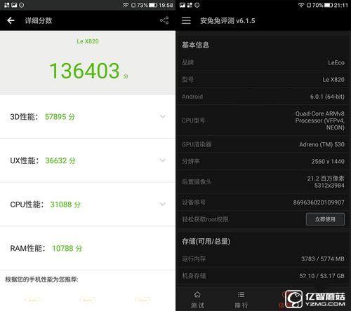 高通驍龍820為四核處理器,主頻為2.15GHz,加上6GBRAM,這款樂Max2在安兔兔的跑分輕松破13萬。各項細分項的分值也是名列前茅。