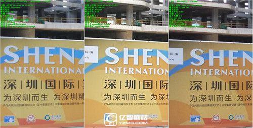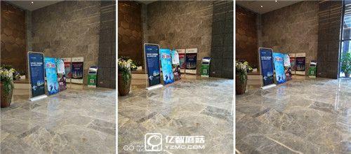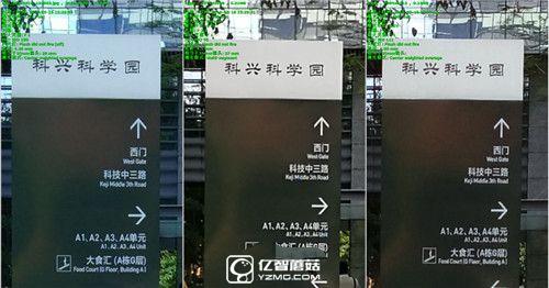 在這組室內(nèi)樣張中,只有小米5的樣張可以清晰的看到藍(lán)色廣告牌下的小字體,華為P9的情況稍好于魅族PRO6。