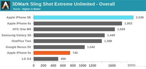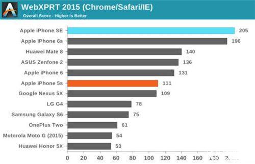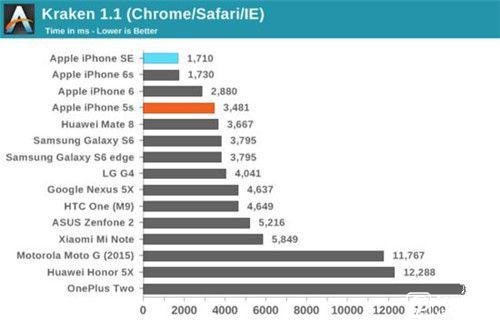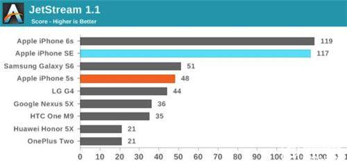 不出所料,iPhone SE在 Javascript測(cè)試中與iPhone 6s不相上下。雖然外形與iPhone 5s相似,但是iPhone SE的提升非常明顯,大約是前者的兩倍,這與蘋果在發(fā)布會(huì)上所說的2 倍性能提升一致。需要指出的是,這些是升級(jí)后的iOS 9 iPhone 5s的數(shù)據(jù),確保它也能受益于蘋果對(duì)Nitro Javascript引擎所做的升級(jí)和完善。
