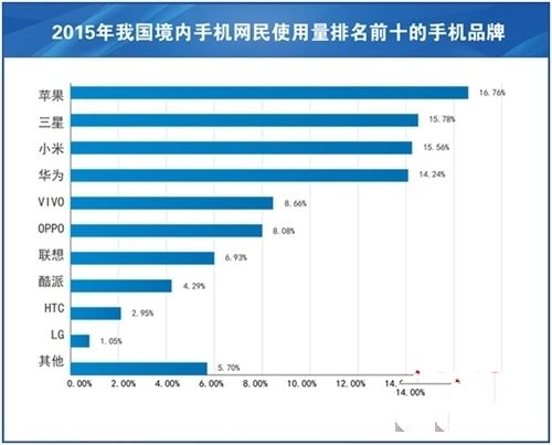 去年,我國手機網民上網使用智能手機最多的前三個品牌分別是蘋果、三星和小米,分別占到了16.76%、15.78%、15.56%。