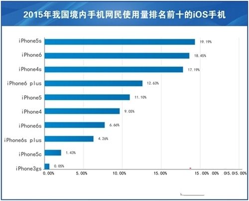 iOS設備中,iPhone5S 19.19%擁有最多用戶,然后是iPhone6 18.45%、iPhone4S 17.19%,而最新的iPhone6S、iPhone6S Plus加起來才剛剛超過10%。