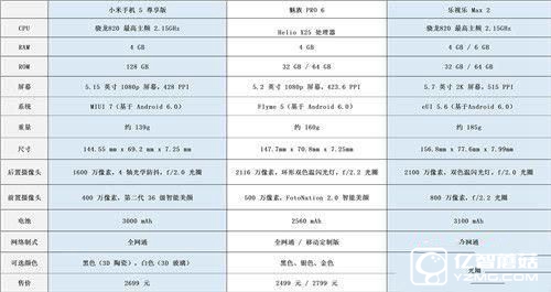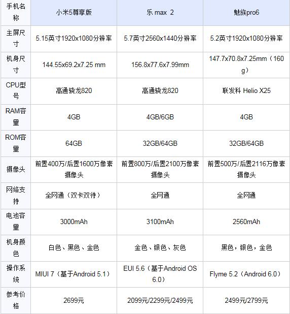 先來看看小米5尊享版、樂max 2和魅族pro6具體配置參數,具體如下所示: