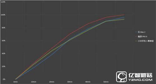 從圖表中我們可以看到,在60分鐘時,魅族PRO6已經完成了充電過程,而小米手機5尊享版和樂Max2基本充到95%上下。考慮到魅族PRO6的電池容量最小,為2560mAh,所以率先完成充電也是情理之中。小米手機5尊享版電電池容量為3000mAh,樂Max2電池容量為3100mAh,結合圖表可以判斷樂Max2在快充方面略勝一籌,而小米手機5尊享版和魅族PRO6的充電效率基本相當。三臺旗艦機型在快充方面的表現都較為優秀,在10分鐘時都已經充到了20%左右的電量,日常應急足夠了。