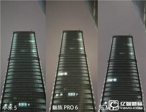 如今的旗艦機型在光線充足的情況基本都不會出現什么大毛病,夜晚才是真正考驗拍照性能的時候。我們來看一組夜間樣張的對比,三臺旗艦機的樣張畫面都出現了不同程度的噪點,魅族PRO6的噪點較少,但畫面涂抹感較重,大廈窗戶的輪廓變得有些模糊不清,在白平衡上也出現了一些偏移,大廈的顏色變得有些黃。相比之下,小米手機5尊享版和樂Max2的白平衡較準,但畫面噪點偏多,使得整體樣張不夠干凈。