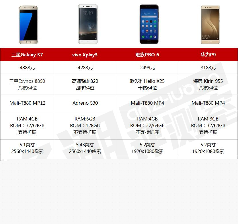 內(nèi)存三星Galaxy S7>華為P9>vivo Xplay5旗艦版>魅族PRO 6