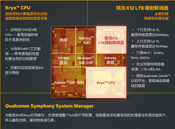 驍龍820主要由Kryo CPU、Adreno 530 GPU、Spectra ISP、Hexagon 680 DSP和驍龍X12 LTE調(diào)制解調(diào)器組成。SoC內(nèi)部通過Qualcomm Symphony System Manager進(jìn)行統(tǒng)籌,合理調(diào)度各個(gè)模塊進(jìn)行運(yùn)算并獲得最高能效比。驍龍820給我們最大的印象就是充分體現(xiàn)了分工合作的異構(gòu)計(jì)算思想,CPU負(fù)責(zé)通用計(jì)算部分,GPU專注圖形處理過程,ISP鉆研拍照時(shí)候各種算法,DSP統(tǒng)籌各種內(nèi)部傳感器,驍龍X12 LTE調(diào)制解調(diào)器讓網(wǎng)絡(luò)傳輸速度更快,兼?zhèn)銿oLTE、4G+和全網(wǎng)通等特性。