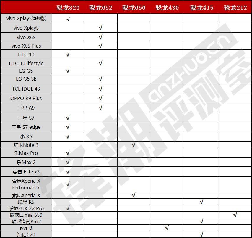 如上圖所示,這就是16年前四個(gè)月Qualcomm旗下6款最新最熱門的處理器所搭載的機(jī)型一覽表。旗艦級別有驍龍820和驍龍652兩款處理器加持,中高端級別則交給驍龍652和驍龍650把關(guān),中端市場則繼續(xù)由上年年底開始發(fā)力的驍龍616和驍龍617看守,中低端市場則留給驍龍430、驍龍415和驍龍212開疆拓土。