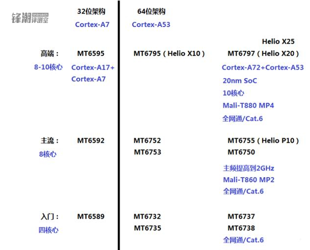 作者先將32位架構(gòu)和64位架構(gòu)的處理器楚河漢界劃分開來,在32位架構(gòu)時(shí)代,Cortex-A7架構(gòu)是聯(lián)發(fā)科摯愛。而在64位架構(gòu)時(shí)代,Cortex-A53架構(gòu)成為了新寵。當(dāng)然每個(gè)時(shí)期頂級的處理器依然會采用更高能效比的核心,例如32位時(shí)期的Cortex-A17和64位時(shí)期的Cortex-A72。