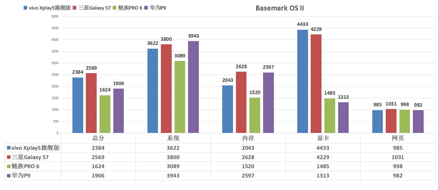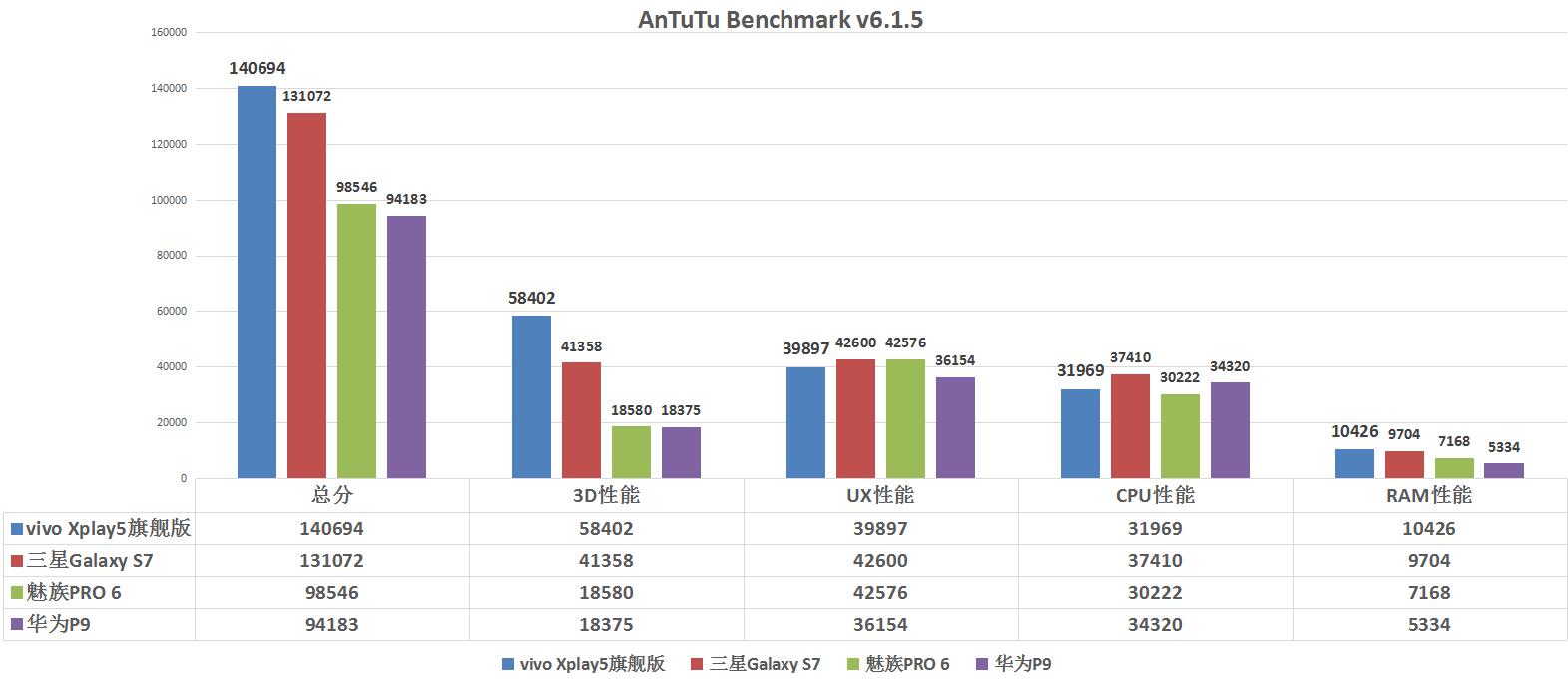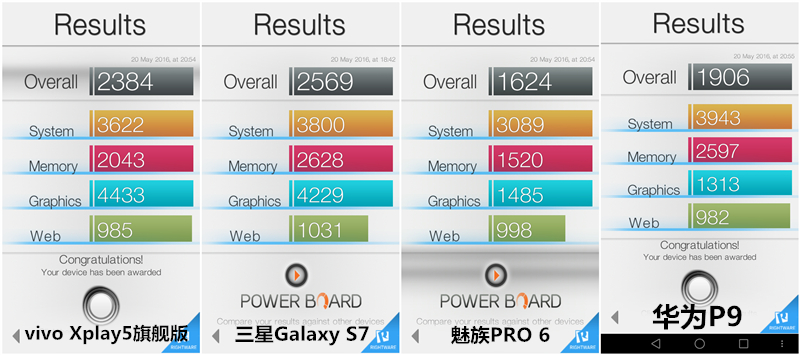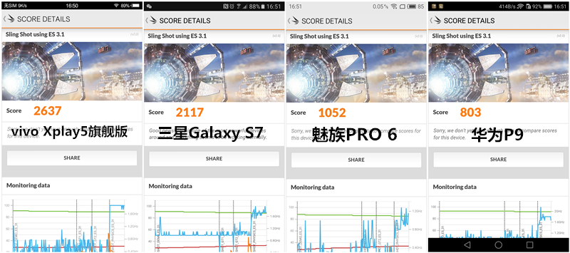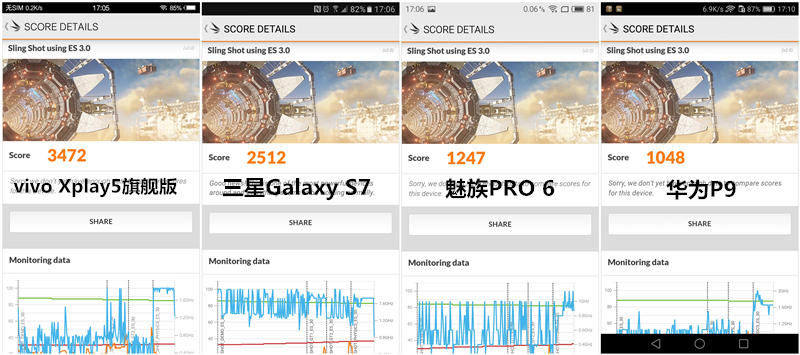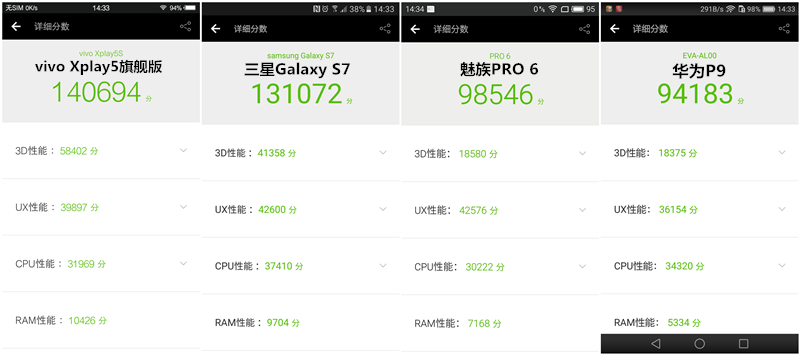 性能測試結(jié)果:vivo Xplay5旗艦版>三星Galaxy S7>魅族PRO 6> 華為P9