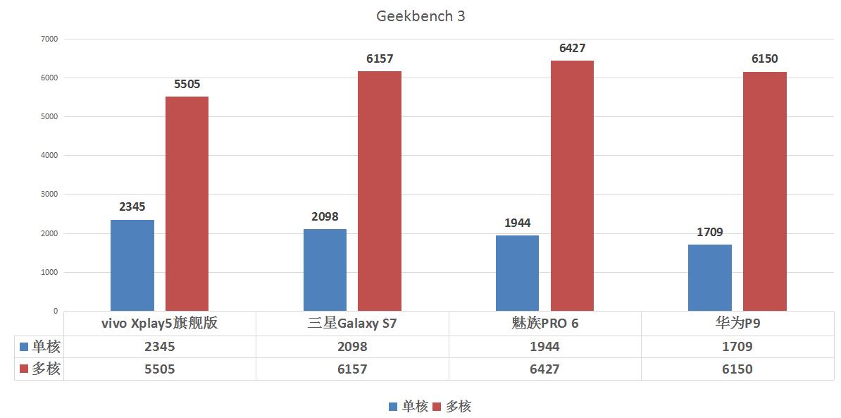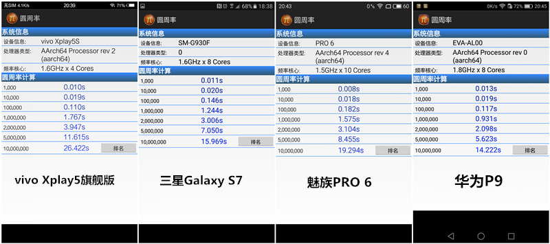 多核魅族PRO 6>華為P9>vivo Xplay5旗艦版>三星Galaxy S7