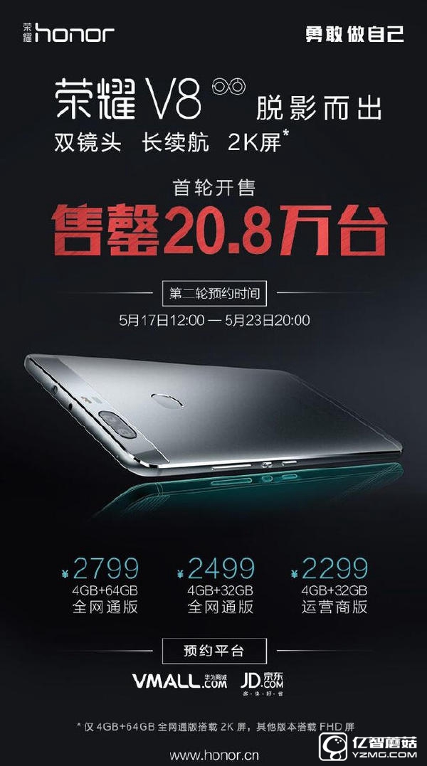 這個手機就是榮耀剛剛在5.10日發布的榮耀V8!如下圖,是不是很帥: