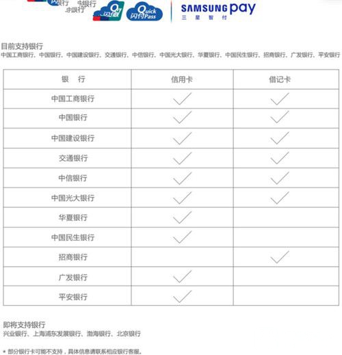 銀聯(lián)中的大部分銀行均與三星展開合作首批開始提供服務(wù)的銀行包括:中國工商銀行(信用卡)、中國銀行(信用卡及借記卡)、中國建設(shè)銀行(信用卡及借記卡)、中信銀行(信用卡及借記卡)、中國光大銀行(信用卡)、華夏銀行(信用卡)、中國民生銀行(信用卡)、招商銀行(借記卡)、廣發(fā)銀行(信用卡)和平安銀行(信用卡)、交通銀行、興業(yè)銀行、上海浦東發(fā)展銀行、渤海銀行、北京銀行。