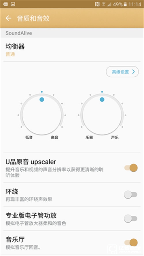 在設(shè)置界面當(dāng)中,我們可以使用任意耳機(jī)進(jìn)行U品質(zhì)原音調(diào)試。簡單說的說就是將已經(jīng)從無損壓縮的音頻文件通過軟硬件調(diào)試的方式盡量去還原。軟件方面,U品原音可以調(diào)試環(huán)繞效果、專業(yè)版電子管功放、音樂廳效果。針對個人優(yōu)化方面,也可以進(jìn)行優(yōu)化聲音的細(xì)微調(diào)試,這一點(diǎn)也屬于音頻方面的私人訂制。這一點(diǎn)三星也抓住年輕用戶在使用手機(jī)當(dāng)中有70%以上時間都會聽音樂的特點(diǎn),在使用配備UHQA的手機(jī)上使用普通耳機(jī)也可以達(dá)到以往上千元耳機(jī)的效果。
