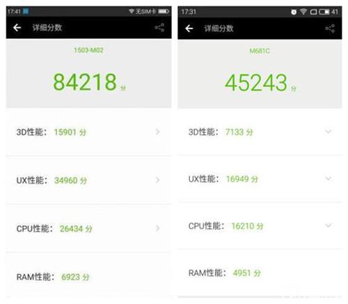 左圖為360手機N4跑分成績,右圖為魅藍Note3跑分成績