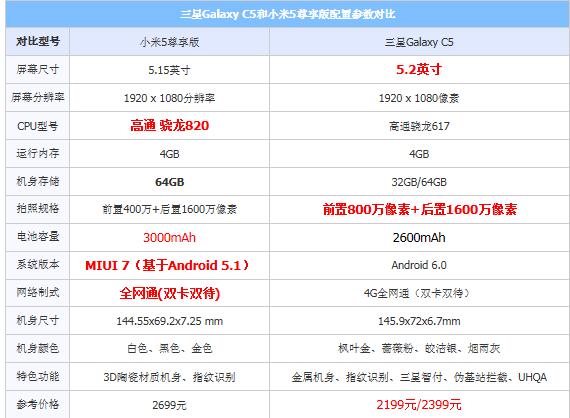 三星GalaxyC5和小米5尊享版配置區別對比評測