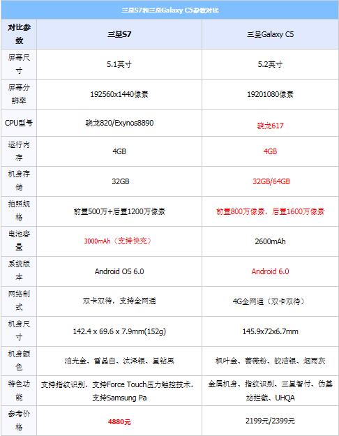 三星Galaxy C5和三星Galaxy S7配置對比評測