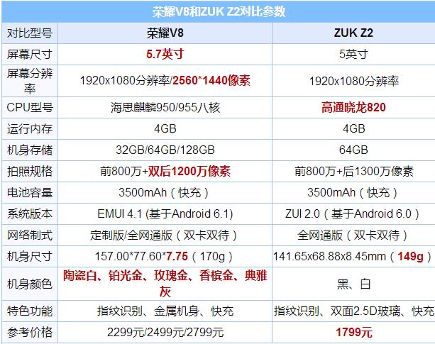 小編還是按照一貫的風格,先來看看ZUK Z2和榮耀V8硬件配置參數(shù)對比情況,如下圖所示。
